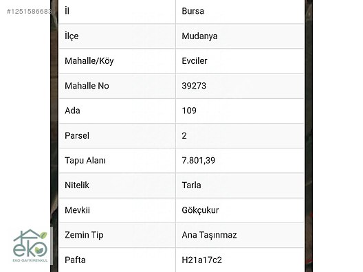 Arazimiz Mudanya Evciler'de, 109 Ada 2 Parsel, 7.801 metrekaredir. Asfalt yola cephe, Kadastro yolu var. Yatırım değeri yüksek bir konumdadır. Konumu doğru işaretlenmiştir yeri görebilirsiniz. Detaylı bilgi ve iletişim için arayınız.
