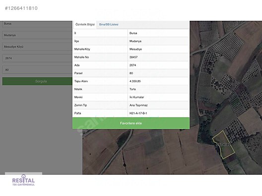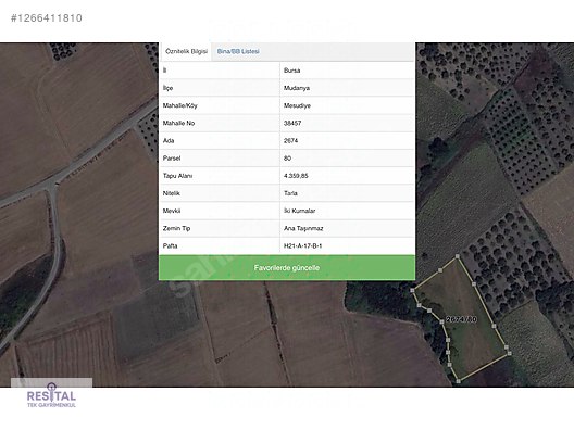 Mudanya Mesudiye de 4358m2 Müstakil AraziMesudiye Köye kuş uçuşu 937mMesudiye Plajına kuş uçuşu 3,29km Görükle ye kuş uçuşu 23,72km uzaklıkta olanYatırımlık ArazininYeni Sahibiyle Görüşmek ÜzereResital Tek GayrimenkulDinçer Temur