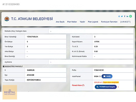 Samsun’un en hızlı gelişen bölgelerinden Atakum Büyükoyumca’da, 3 Kat İmarlı 624 m² arsamız satışa sunulmuştur.8124 ADA 3 PARSELArsamız 3 kat imarlıdır.Emsal (KAKS) 0.60, Taban Oturumu (KAKS) 0.20Toplan Alan 624,80 m2 Arsamız yol cephesi 21,87 metre, derinlik 27,6 metredir.İkiz Villa yapımına da uygundurYol, su, elektrik altyapısı hazırdır.Toplu Konut Bulvarı’na da üçüncü parseldirYakınında otobüs durakları vardır. 15 dakika ve 30 dakika ara ile geçmektedir.Ulusal ve yerel marketlere yakındır.Zeminden Deniz Manzarasını almaktadır.İkiz Villa yapımına da uygundurBölgenin sürekli değer kazanan lokasyonundadırEtrafında lüks villalar bulunmaktadır.Detaylı Bilgi İçinİsmail AKSU0532 654 26 82Resital Open -Gayrimenkul DanışmanıTaşınmaz Ticareti Yetki Belge No:5500693-002
